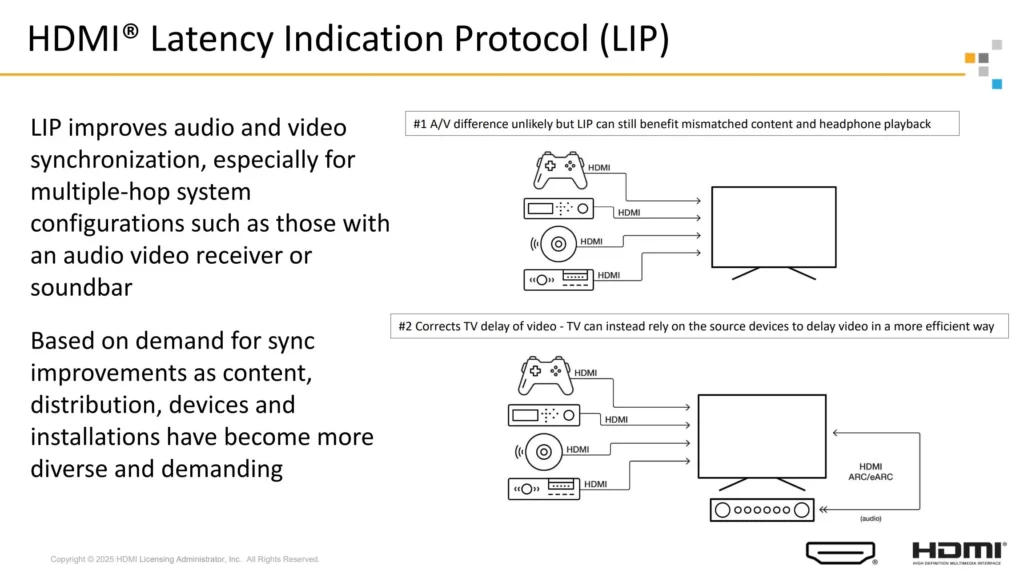 Особое внимание уделено синхронизации — новый протокол LIP (Latency Indication Protocol) обеспечивает идеальную синхронизацию аудио и видео, оптимизирует работу сложных систем (AV-ресиверы, саундбары) и минимизирует задержки, что особенно важно для геймеров и киноманов. Эти улучшения делают HDMI 2.2 по-настоящему революционным стандартом для нового поколения мультимедийных устройств.